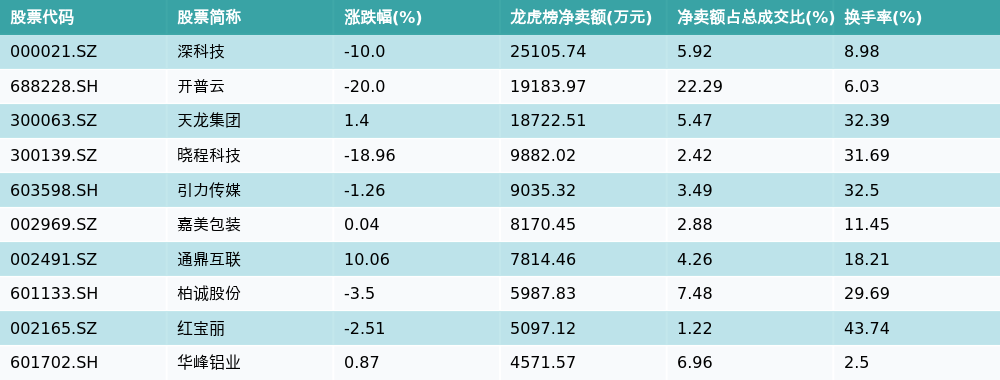 南财智讯2月2日电,盘后数据显示,因当日异动登上龙虎榜的个股中,龙虎榜中资金净流出最多的前三位分别是深科技(000021.SZ)、开普云(688228.SH)与天龙集团(300063.SZ)。其中排名第一的深科技被净卖出2.51亿元,占总成交金额的5.92%。深科技收盘下跌10.0%,换手率为8.98%。净卖出额前10个股详情见下图: