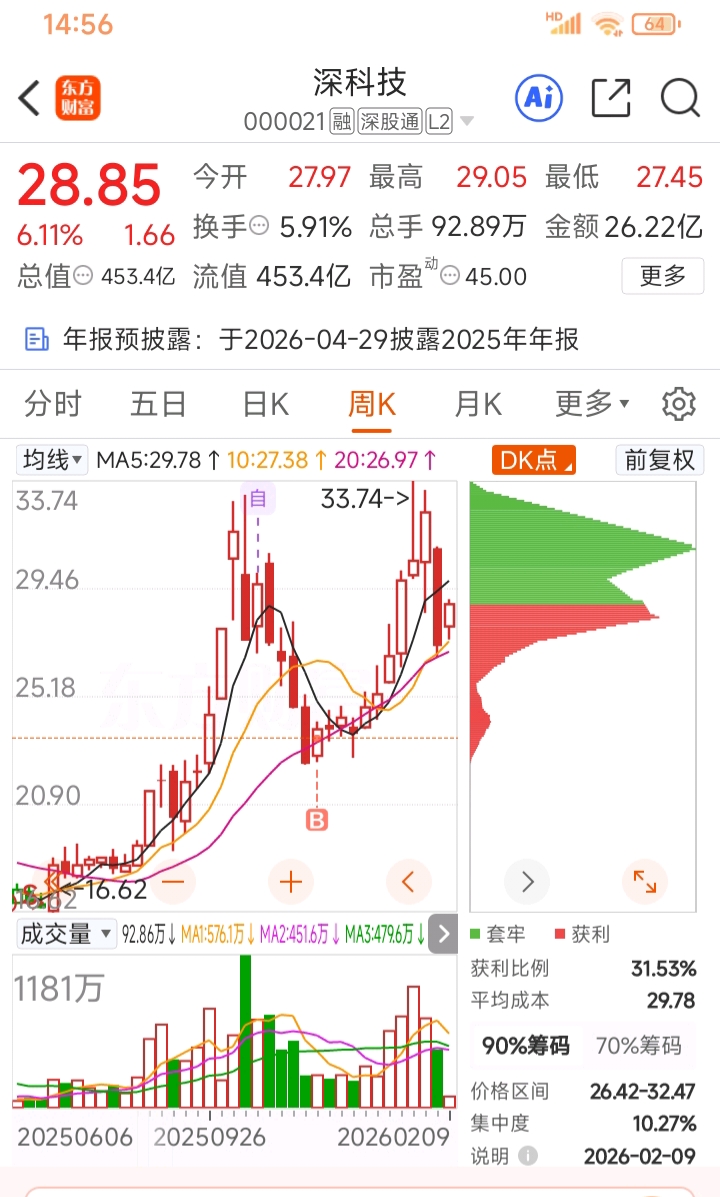 $深科技(SZ000021)$ 距离高点还亏15个点