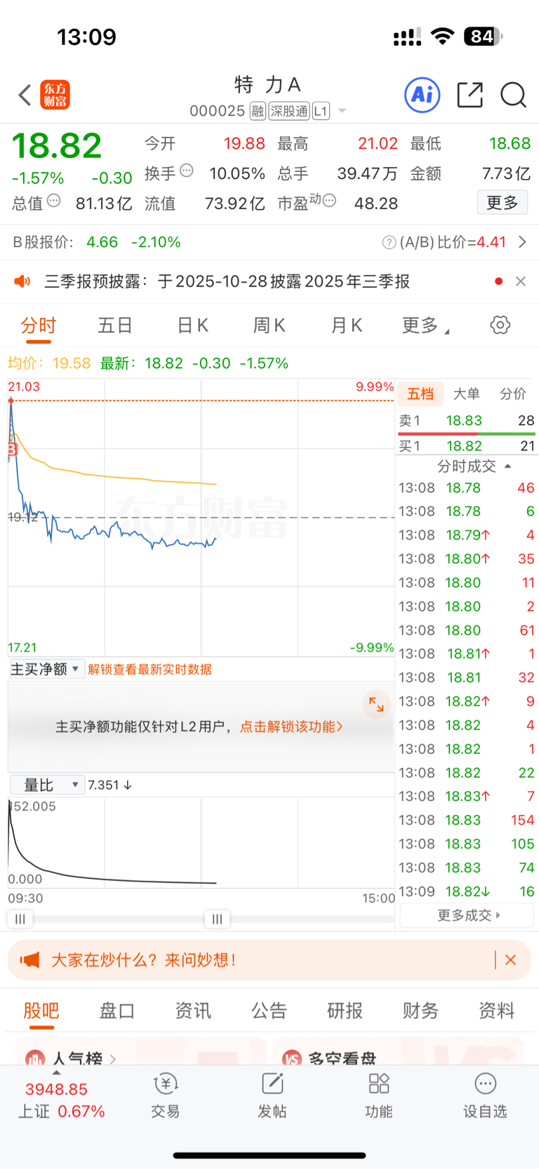 $特 力A(SZ000025)$ 大家好我是韭菜