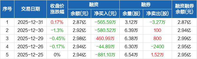 特力A:融资净偿还565.59万元,融资余额2.87亿元(12-31)