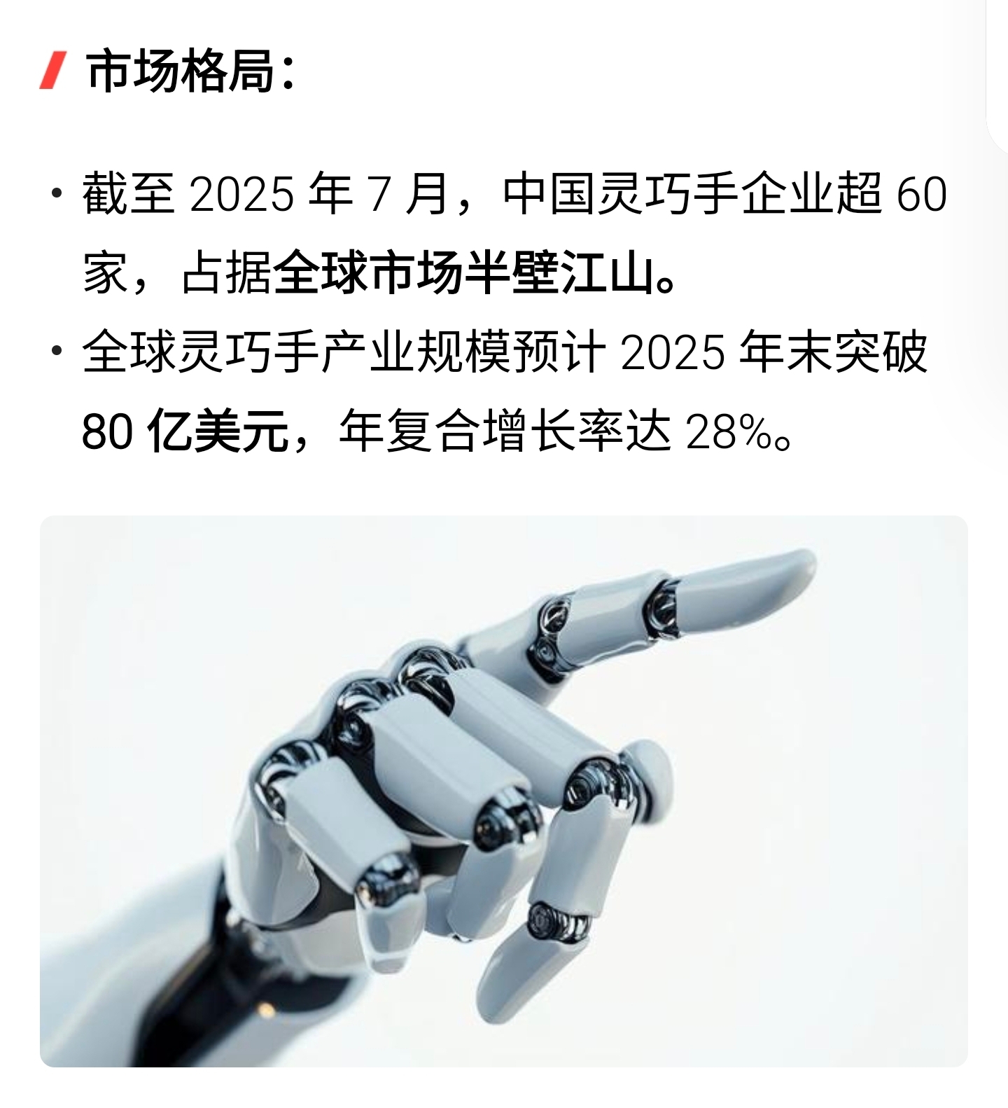 占据全球市场半壁江山,意味着国内灵巧手产业规模预计2025年末突破40亿美元,年