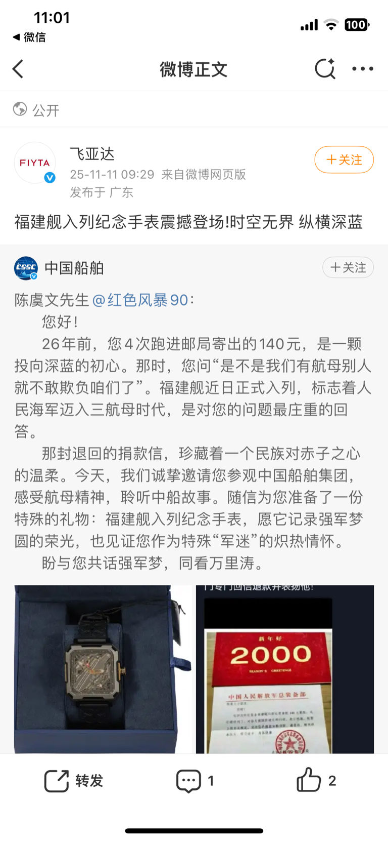 $飞亚达(SZ000026)$ 捐款140元造航母的“小朋友”,收到中国船舶邀请