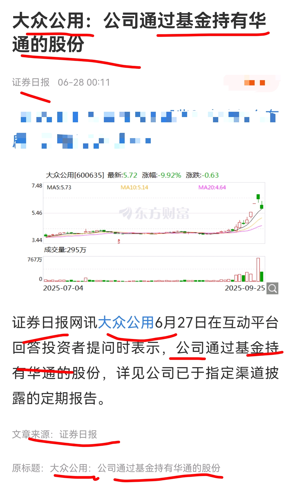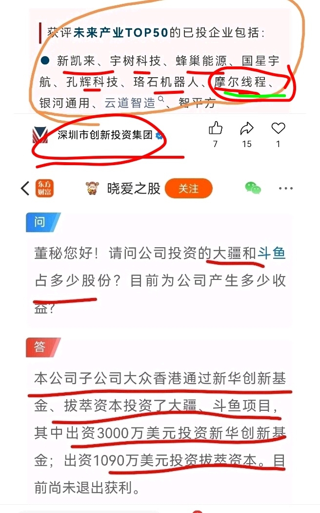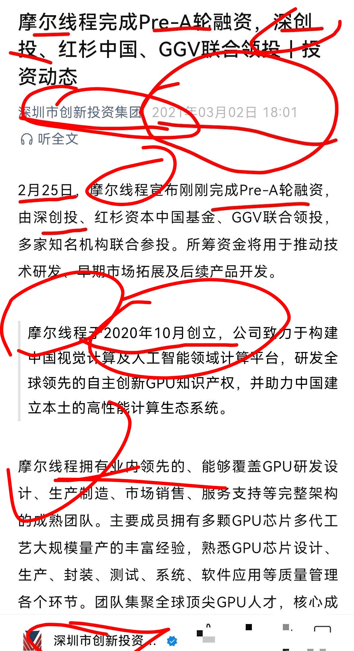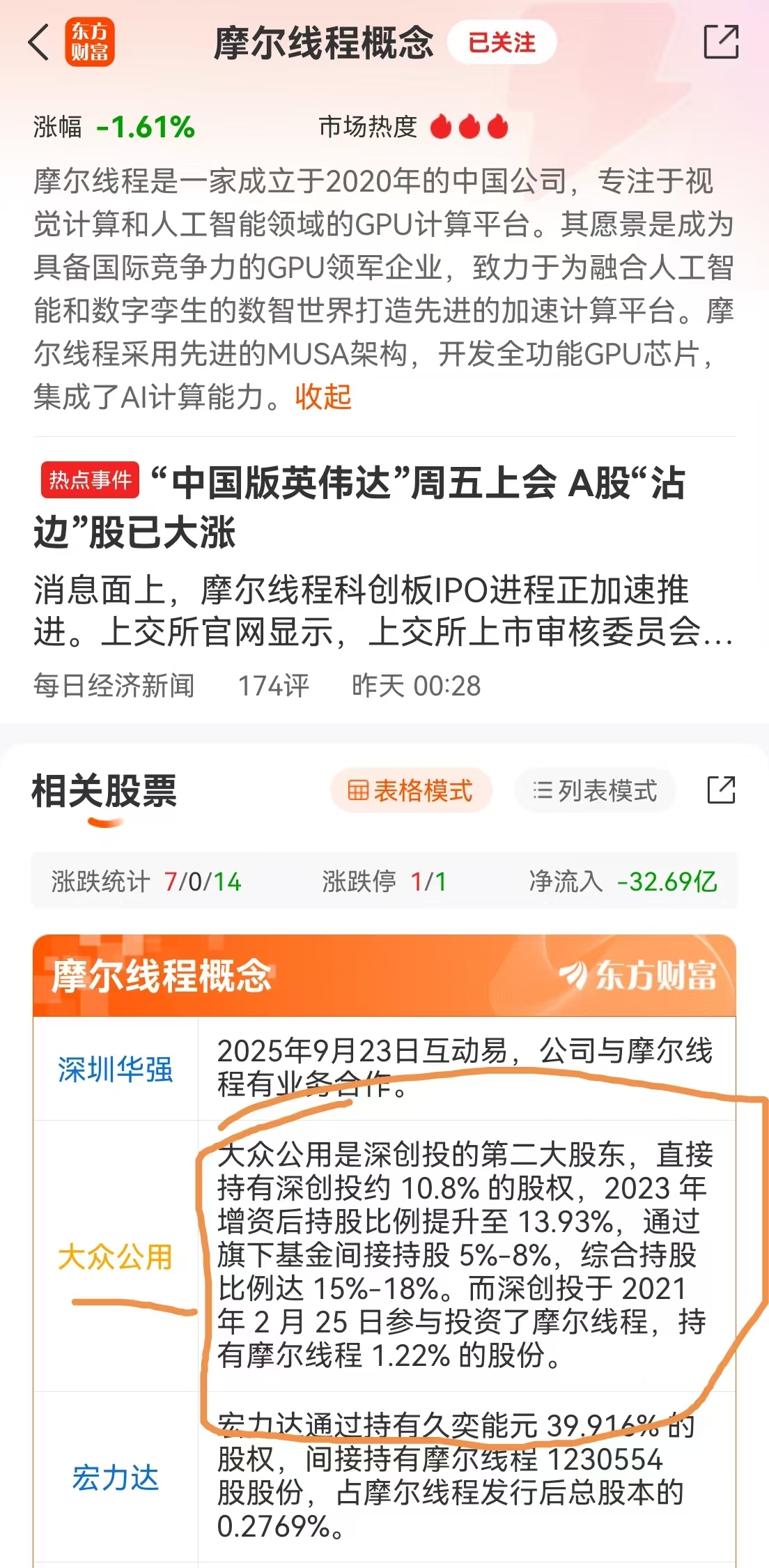 $ST华通(SZ002602)$ 大众公用是深创投的第二大股东,直接持有深创投约10.8%的股权,2023年增资后持股比例提升至13.93% ,通过旗下基金间接持股5%-8% ,综合持股比例达15%-18%,而深创投2021年2月15日参与投资了摩尔线程,持有摩尔线程1.22%的股份。