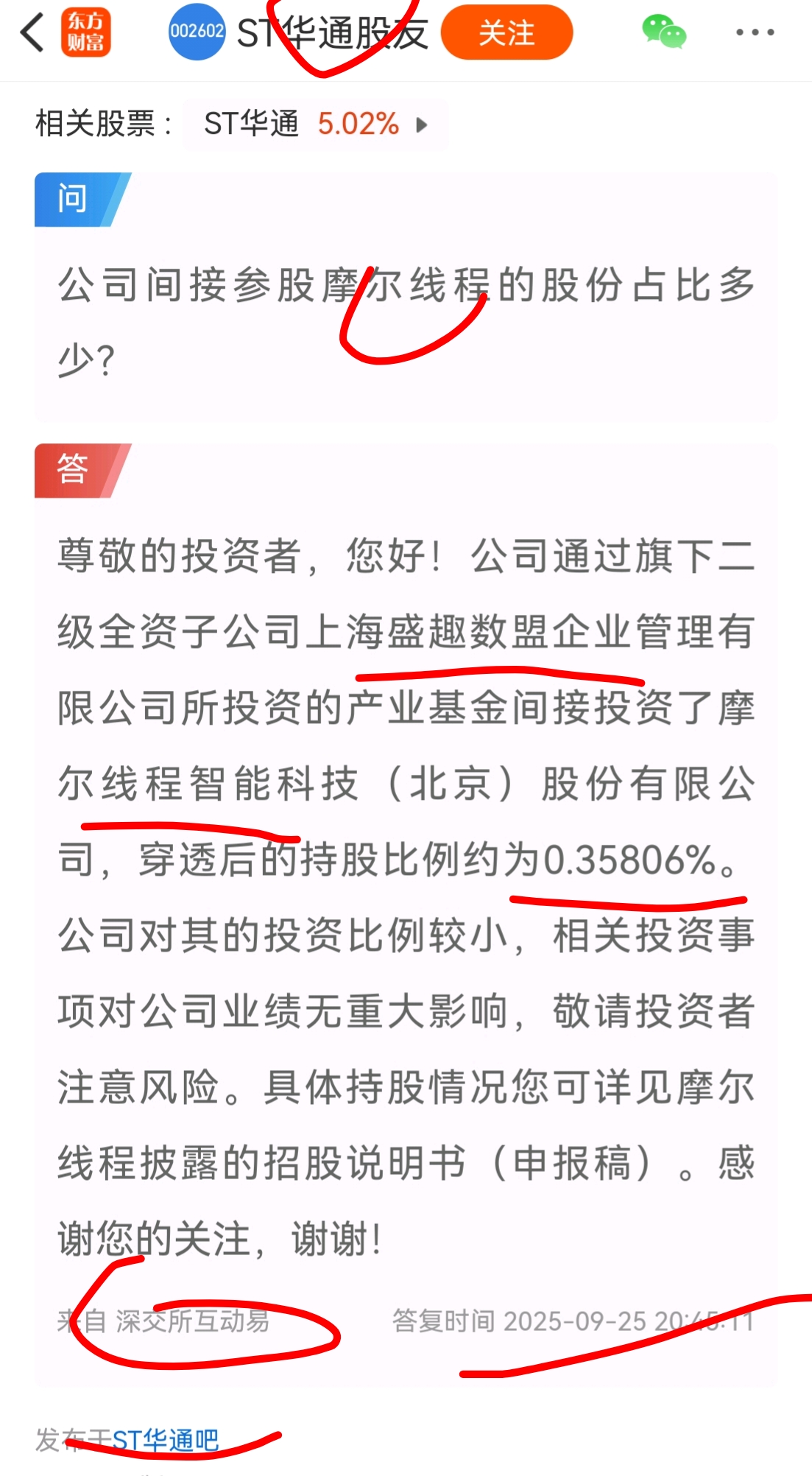 原标题:ST华通:间接投资摩尔线程,持股比例约0.35806%,对业绩无重大影响