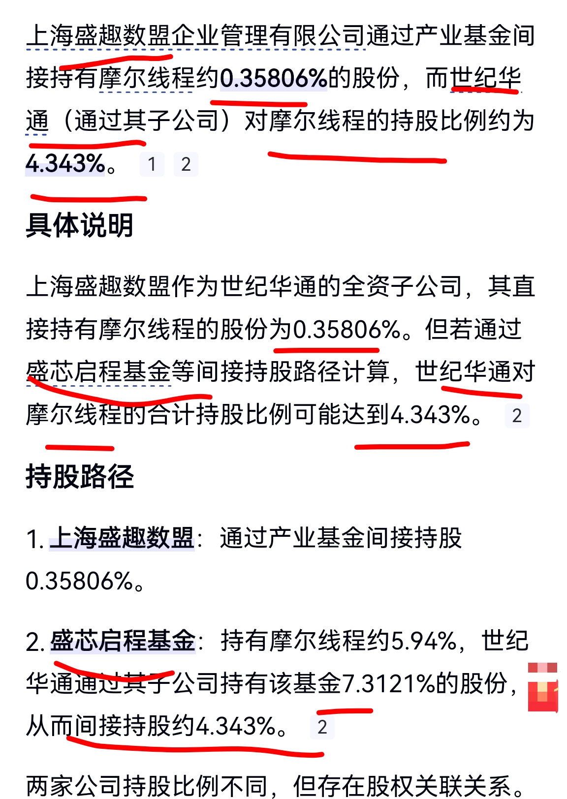 9月25日,浙江世纪华通集团股份有限公司(ST华通,002602.SZ)在深交所互动易平台表示,公司通过旗下二级全资子公司上海盛趣数盟企业管理有限公司所投资的产业基金间接投资了摩尔线程智能科技(北京)股份有限公司(下称“摩尔线程”),穿透后的持股比例约为0.35806%。公司对其的投资比例较小,相关投资事项对公司业绩无重大影响。