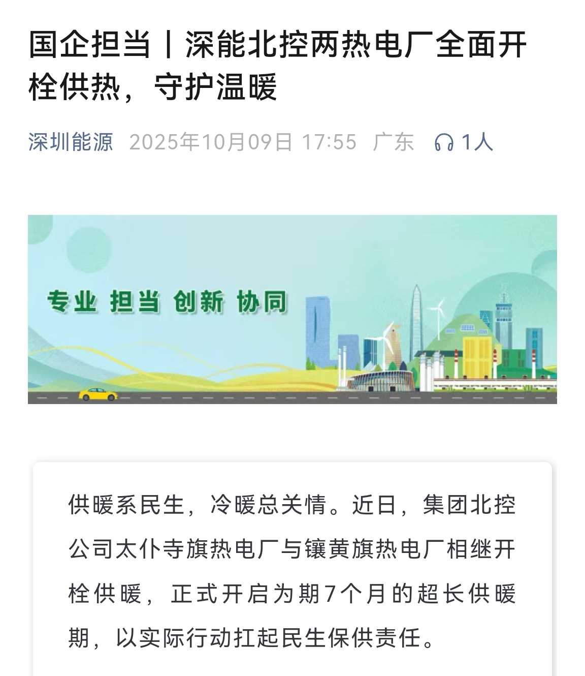 $深圳能源(SZ000027)$ 当广东的天气仍十分炎热,用电仍处高峰之际,新疆与内蒙的供暖已提前开启,贡献新的营收。