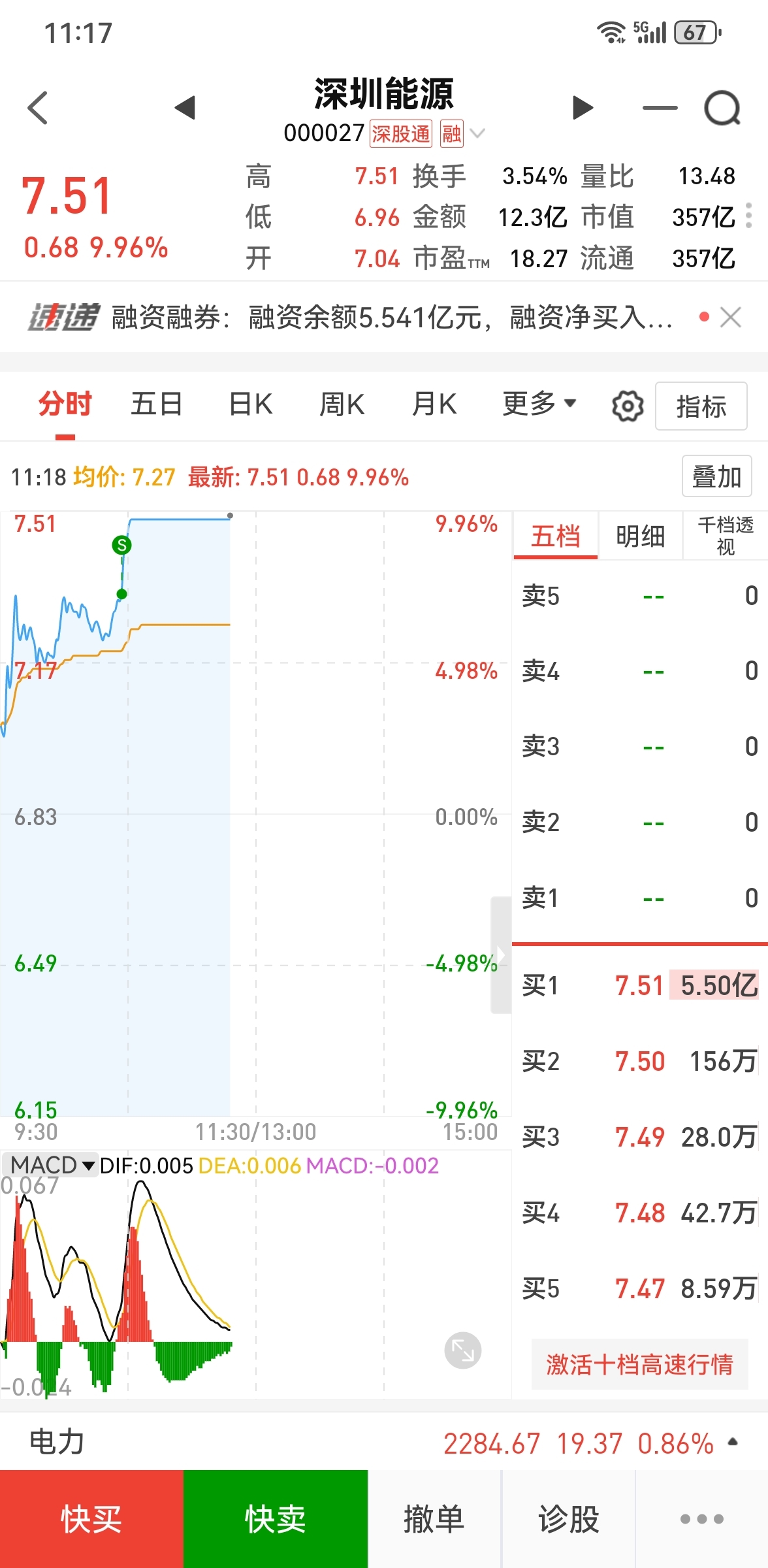 $深圳能源(SZ000027)$ 随便打了一个7.38,看都没看就干活了,竟然卖在涨停前。