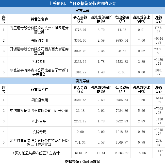 今日龙虎榜单上出现了深股通的身影,占据了买二、卖一的位置,净卖出6444.89万元,占当日成交总额的5%。