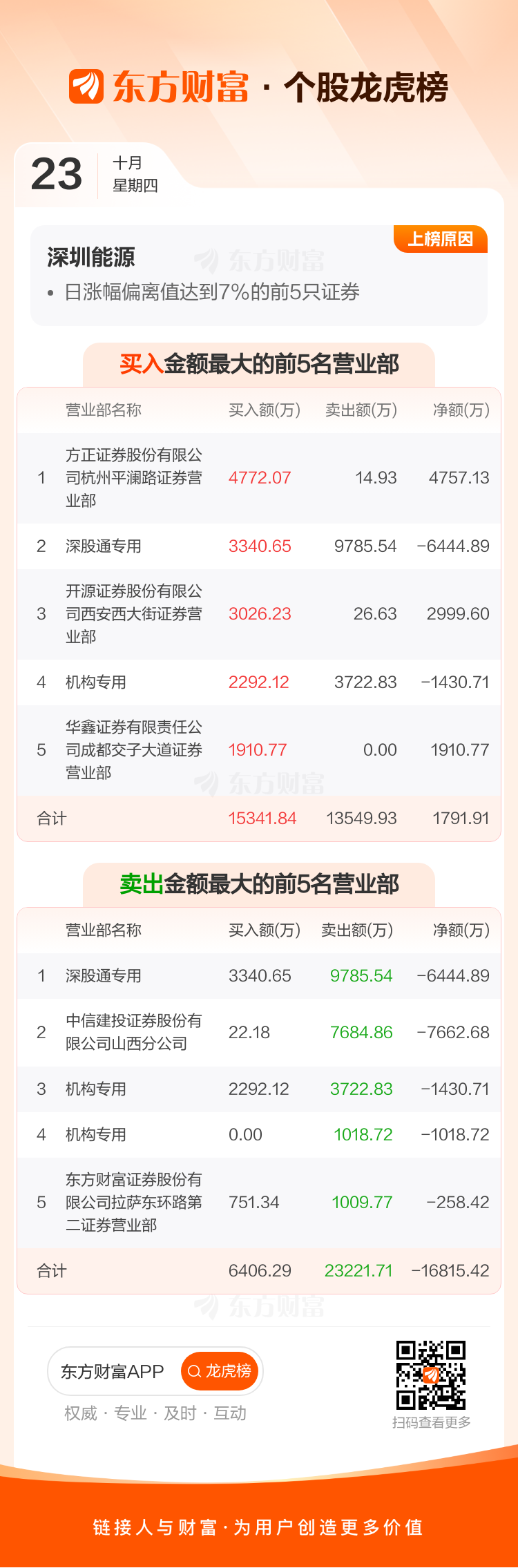 交易所2025年10月23日公布的交易公开信息显示,深圳能源因成为日涨幅偏离值达到7%的前5只证券上榜。深圳能源当日收报7.51元,涨跌幅9.96%,偏离值9.78%,换手率3.72%,成交额12.88亿。
