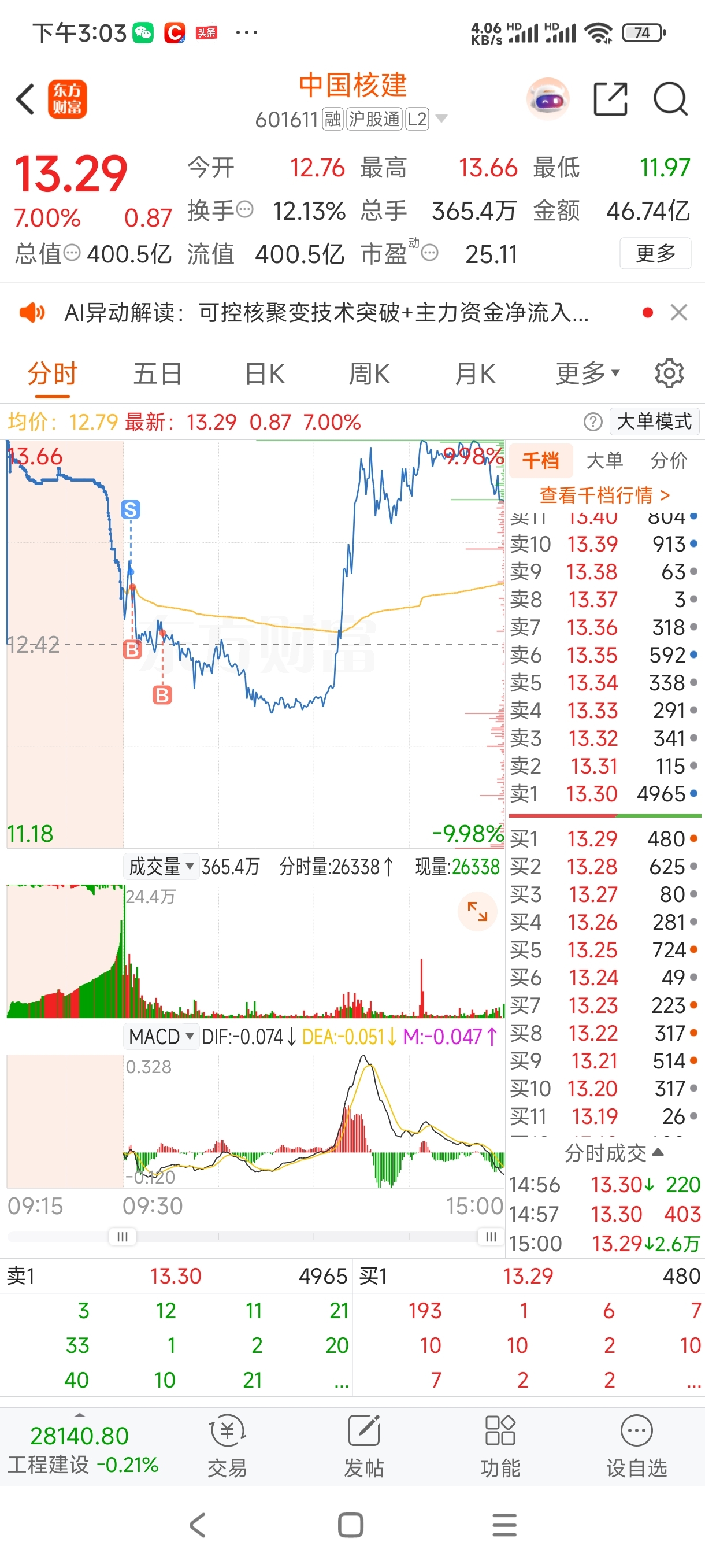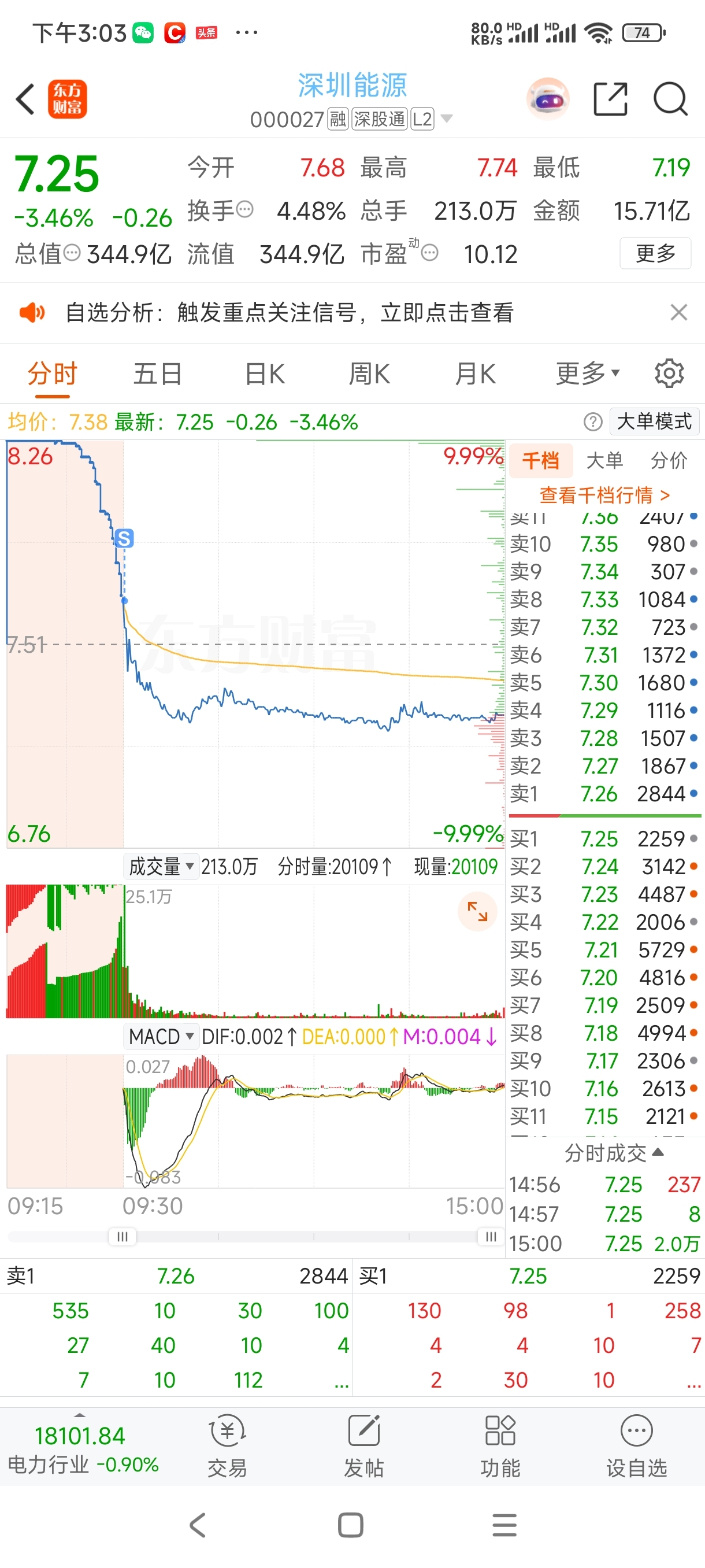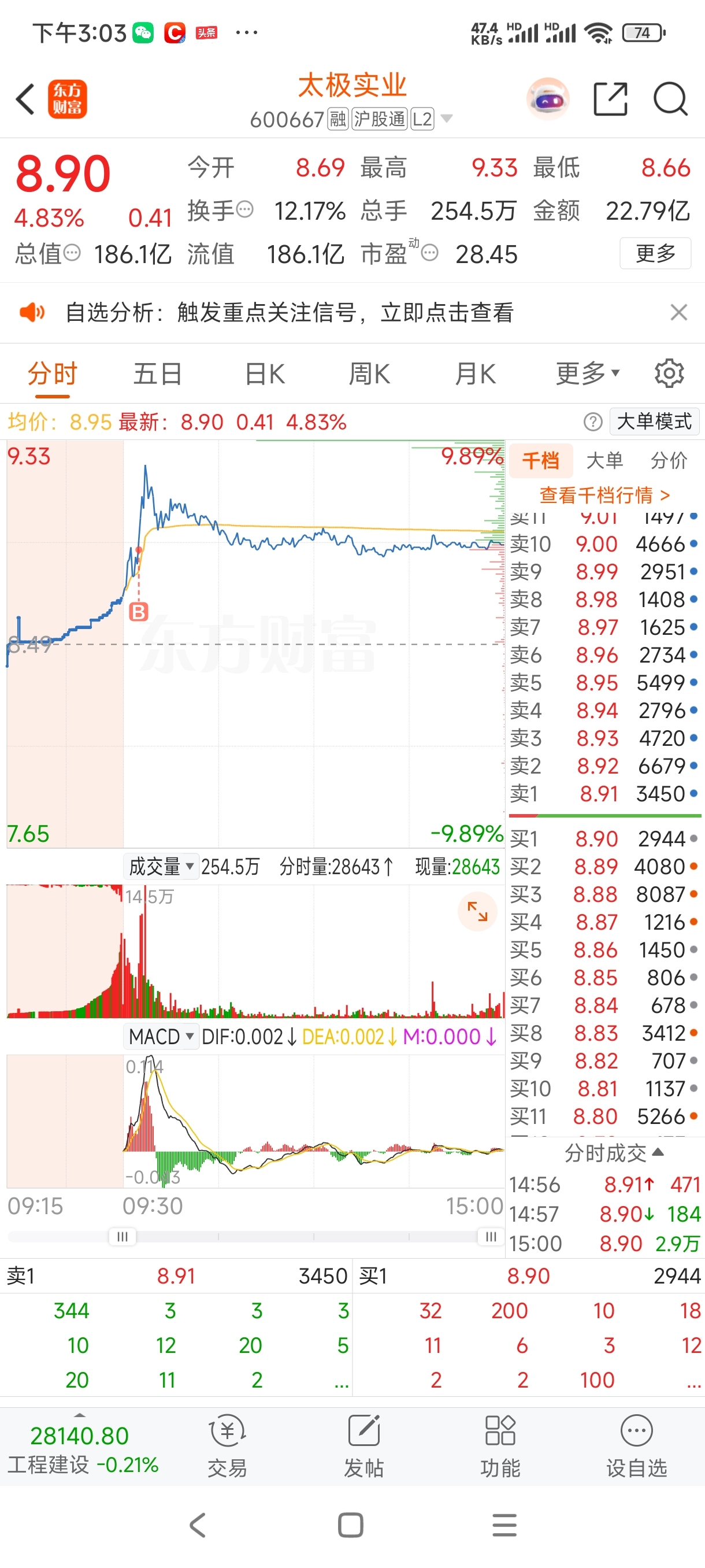 $深圳能源(SZ000027)$ 今天的操作比较一般,核建接回来的太早了,在太极两进两出,挨了两次打,今天8.88半仓进了,差一分封板,早盘成交太小。全天在8.9出多空进行激战,前高位置多洗洗是有好处的,周末如果有利好的话,不排除周一开始逼空行情。下周核建行情个人认为没有走完,只是不会很顺,离五日线有点远。看太极竞价,重点观察汇顶科技,商业航天。