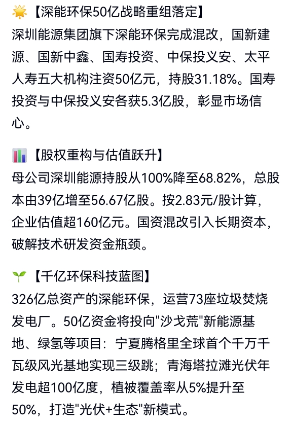 【深能环保50亿战略重组落定】深圳能源集团旗下深能环保完成混改,国新建源、国新中鑫、国寿投资、中保投义安、太平人寿五大机构注资50亿元,持股31.18%。国寿投资与中保投义安各获5.3亿股,彰显市场信心。【股权重构与估值跃升】母公司深圳能源持股从100%降至68.82%,总股本由39亿增至56.67亿股。按2.83元/股计算,企业估值超160亿元。国资混改引入长期资本,破解技术研发资金瓶颈。【千亿环保科技蓝图】326亿总资产的深能环保,运营73座垃圾焚烧发电厂。50亿资金将投向"沙戈荒"新能源基地、绿氢等项目:宁夏腾格里全球首个千万千瓦级风光基地实现三级跳;青海塔拉滩光伏年发电超100亿度,植被覆盖率从5%提升至50%,打造"光伏+生态"新模式。【产融协同新范式】险资提供长期资本,央企基金导入技术资源,形成"资金+技术+场景"闭环。混改2.0阶段下,深能环保有望复制碧水源混改后现金流改善120%的路径,突破技术壁垒。【双碳战略里程碑】此次重组既是国企治理现代化范本,更是环保产业资本化的重要突破,标志着传统能源集团以资本杠杆撬动绿色未来的产业新纪元。 //@憨态可掬的任念茜 :深圳能源集团股份有限公司(简称:深圳能源集团,股票代码:000027)成立于1991年6月,1993年9月在深圳证券交易所上市,是全国电力行业第一家在深圳上市的大型股份制企业,也是深圳市第一家上市的公用事业股份公司。2007年12月实现整体上市,开创了国内电力公司整体上市的先河。截至2025年6月底,集团总资产1697亿元,归母净资产500亿元。2025年上半年实现营业收入211.4亿元,净利润2...