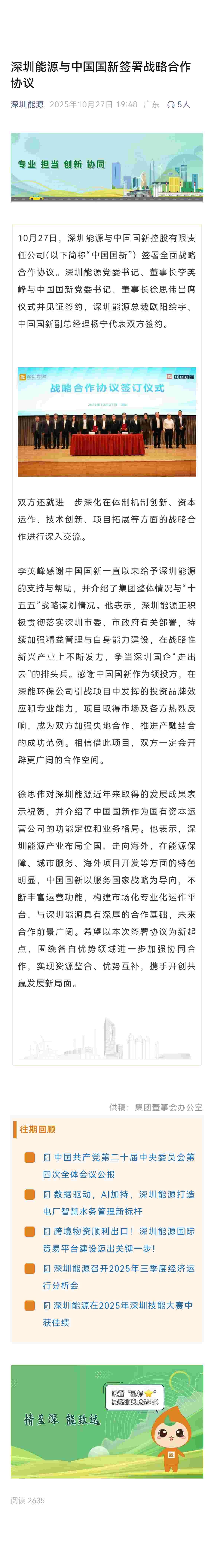 2025年10月27日,深圳能源与中国国新控股有限责任公司签署全面战略合作协议,这是一项具有里程碑意义的合作。