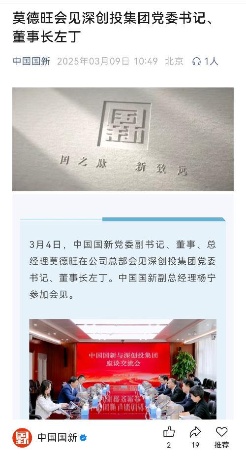 莫德旺会见深创投集团党委书记、董事长左丁 中国国新 2025年03月09日 10:49 北京 1人 3月4日,中国国新党委副书记、董事、总经理莫德旺在公司总部会见深创投集团党委书记、董事长左丁。中国国新副总经理杨宁参加会见。莫德旺对左丁一行到访表示欢迎,并感谢深创投集团长期以来的支持。他表示,中国国新始终聚焦国有资本运营公司功能定位,持续深化运营公司改革,着力发挥基金投资功能作用,积极服务国家战略。中国国新与深创投集团有良好的合作基础,希望双方围绕创投基金运作、战新产业投资、生态圈建设等领域加强战略合作。左丁介绍了深创投集团的发展历程及业务情况。他表示,深创投集团聚焦创新投资,积极探索适合本土基金早期项目投资的打法,希望双方进一步深化创投业务协同,强化生态圈联动,助力央企持续加大战新产业布局,实现互利共赢。中国国新、深创投集团相关单位负责人参加会见。内容来源国新基金