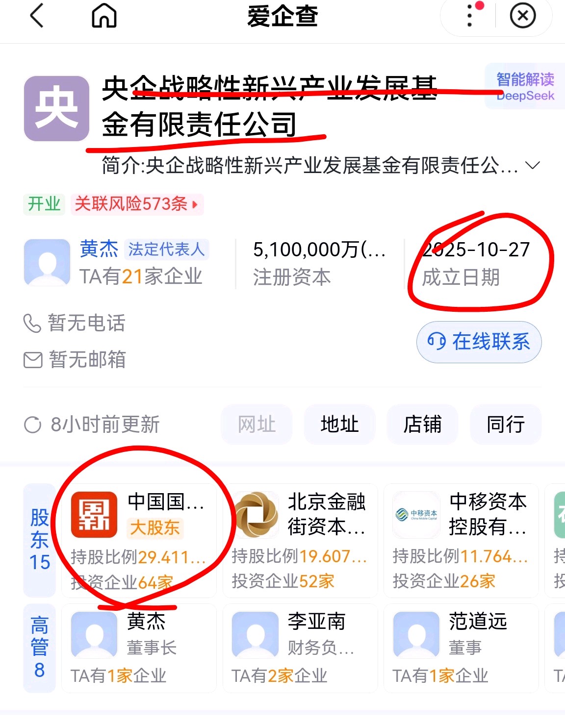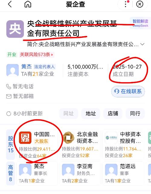 深圳能源千亿市值值得期待!10.27 央企战略性新兴产业发展专项基金有限公司注册成立,同日深圳能源与中国国新签署战略合作协议!董事长亲自到深圳…10月29日,由国务院国资委发起,委托中国国新设立和管理的中央企业战略性新兴产业发展专项基金在北京启动,目前该基金已具备投资条件,将助力战略性新兴产业加速发展。
