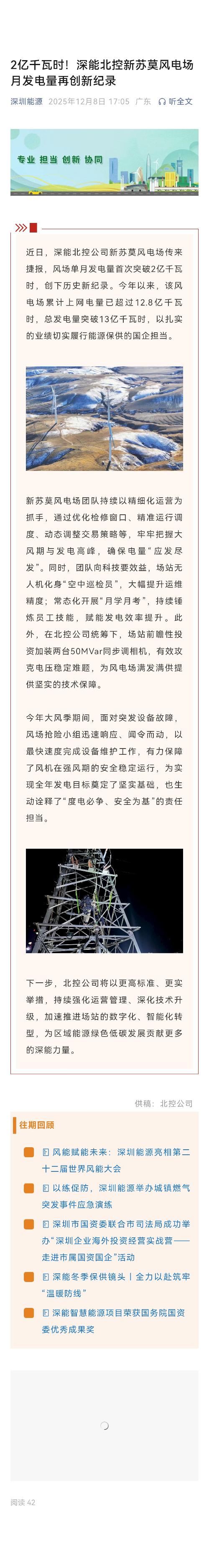 2亿千瓦时!深能北控新苏莫风电场月发电量再创新纪录
