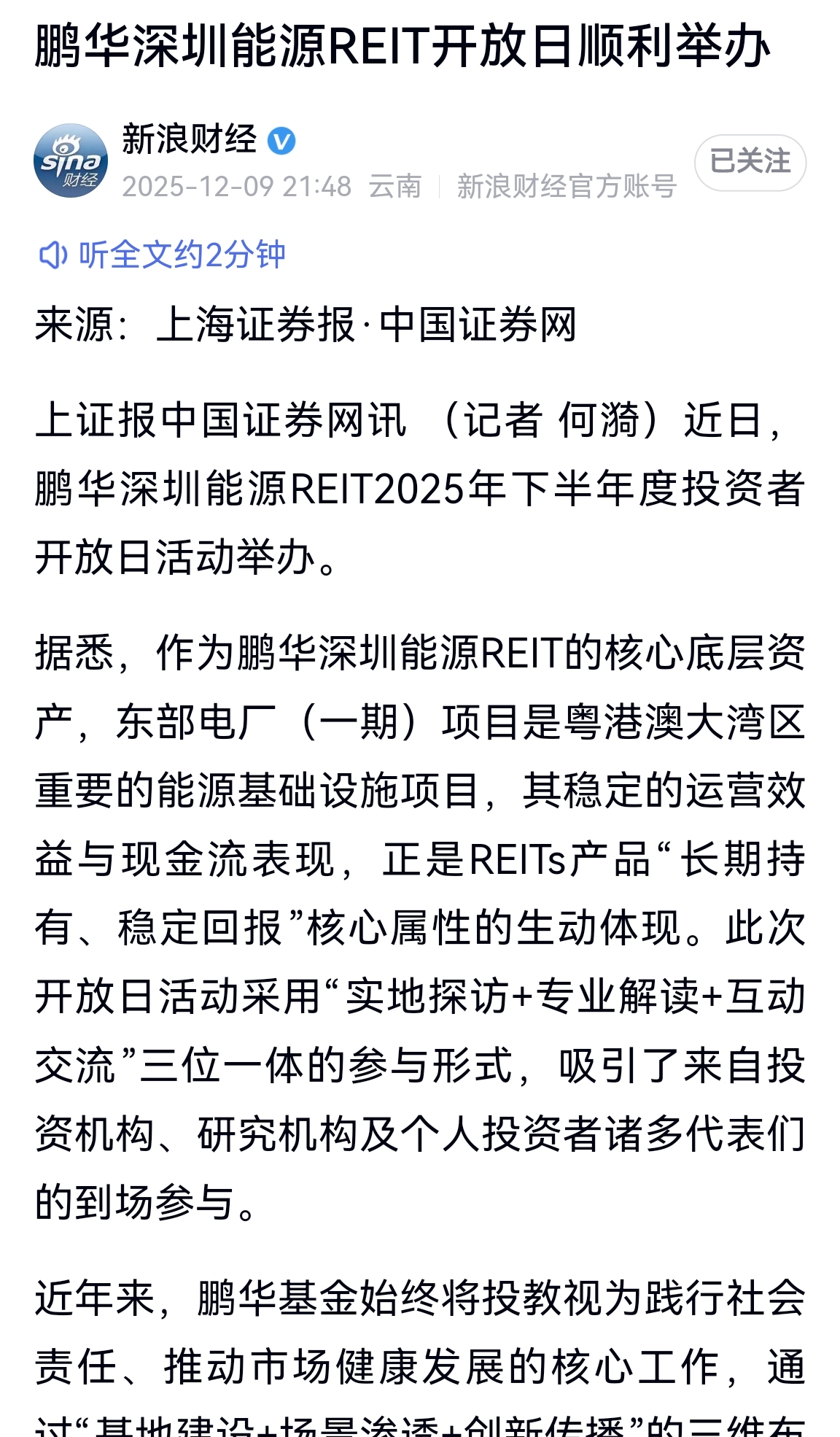 上证报中国证券网讯 (记者 何漪)近日,鹏华深圳能源REIT2025年下半年度投资者开放日活动举办。