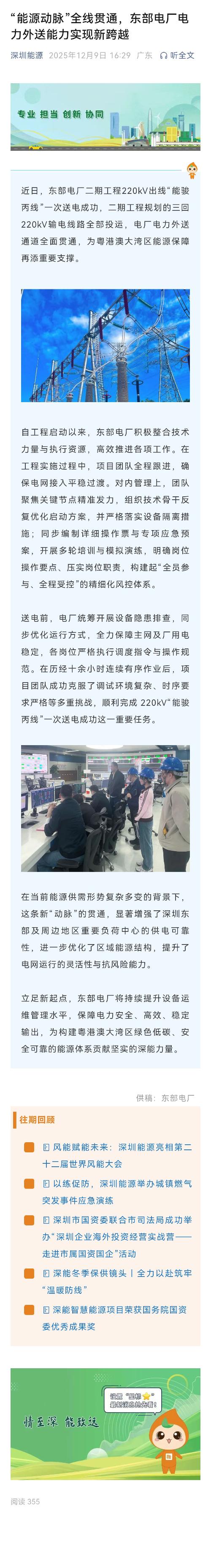 “能源动脉”全线贯通,东部电厂电力外送能力实现新跨越深圳能源 2025年12月9日 16:29 广东 听全文 近日,东部电厂二期工程220kV出线“能骏丙线”一次送电成功,二期工程规划的三回220kV输电线路全部投运,电厂电力外送通道全面贯通,为粤港澳大湾区能源保障再添重要支撑。自工程启动以来,东部电厂积极整合技术力量与执行资源,高效推进各项工作。在工程实施过程中,项目团队全程跟进,确保电网接入平稳过渡。对内管理上,团队聚焦关键节点精准发力,组织技术骨干反复优化启动方案,并严格落实设备隔离措施;同步编制详细操作票与专项应急预案,开展多轮培训与模拟演练,明确岗位操作要点、压实岗位职责,构建起“全员参与、全程受控”的精细化风控体系。送电前,电厂统筹开展设备隐患排查,同步优化运行方式,全力保障主网及厂用电稳定,各岗位严格执行调度指令与操作规范。在历经十余小时连续有序作业后,项目团队成功克服了调试环境复杂、时序要求严格等多重挑战,顺利完成 220kV“能骏丙线”一次送电成功这一重要任务。在当前能源供需形势复杂多变的背景下,这条新“动脉”的贯通,显著增强了深圳东部及周边地区重要负荷中心的供电可靠性,进一步优化了区域能源结构,提升了电网运行的灵活性与抗风险能力。立足新起点,东部电厂将持续提升设备运维管理水平,保障电力安全、高效、稳定输出,为构建粤港澳大湾区绿色低碳、安全可靠的能源体系贡献坚实的深能力量。
