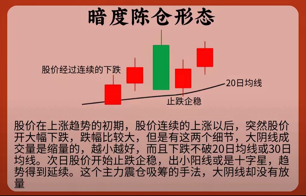 “暗度陈仓”是上涨初期主力震仓吸筹的经典技术形态,核心是“看似下跌、实则藏筹”,具体特征可概括为“1个位置+2个关键细节+1个后续信号”:
