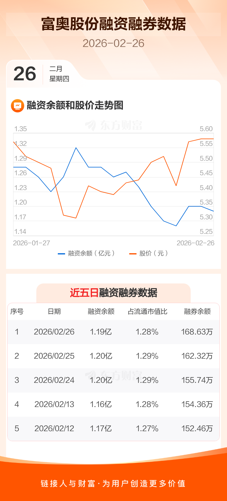 交易所最新数据显示,富奥股份于2026年2月26日获融资买入596.21万元,融资偿还664.26万元,当日融资净偿还68.05万元。目前,该股融资余额1.19亿,占流通市值比例为1.28%。