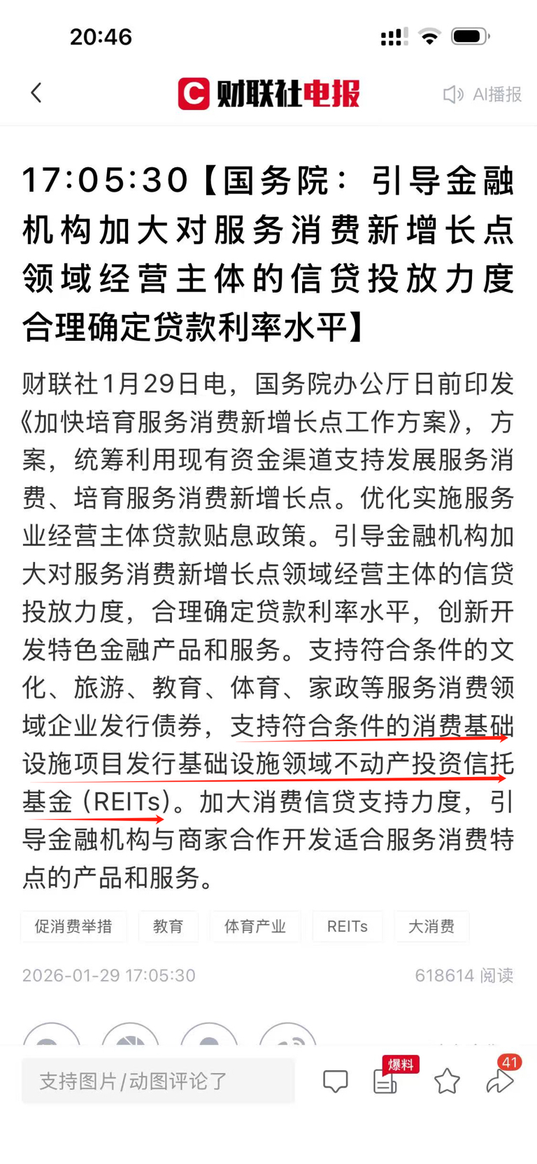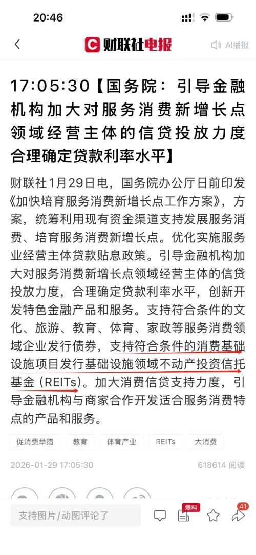 $大悦城(SZ000031)$ $招商蛇口(SZ001979)$ $光大嘉宝(SH600622)$ 财联社1月29日电,国务院办公厅日前印发《加快培育服务消费新增长点工作方案》,方案,统筹利用现有资金渠道支持发展服务消费、培育服务消费新增长点。优化实施服务业经营主体贷款贴息政策。引导金融机构加大对服务消费新增长点领域经营主体的信贷投放力度,合理确定贷款利率水平,创新开发特色金融产品和服务。支持符合条件的文化、旅游、教育、体育、家政等服务消费领域企业发行债券,支持符合条件的消费基础设施项目发行基础设施领域不动产投资信托基金(REITS)。加大消费信贷支持力度,引导金融机构与商家合作开发适合服务消费特点的产品和服务。