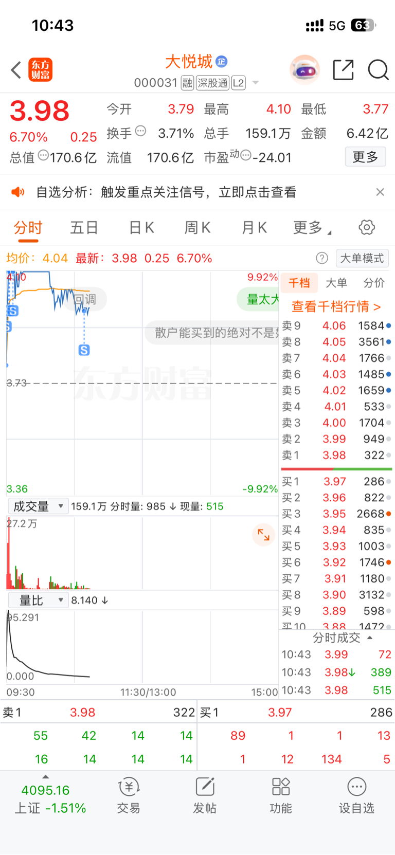 $大悦城(SZ000031)$ 减仓。继续置换券商,一个一个干!