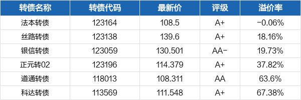 当前神码转债溢价率 = 100% *(债券面值 / 转股价值 - 1) = 100% *(100 / 89.39 - 1) = 11.87%。结合行业、评级等因素后筛选出如下相似转债: