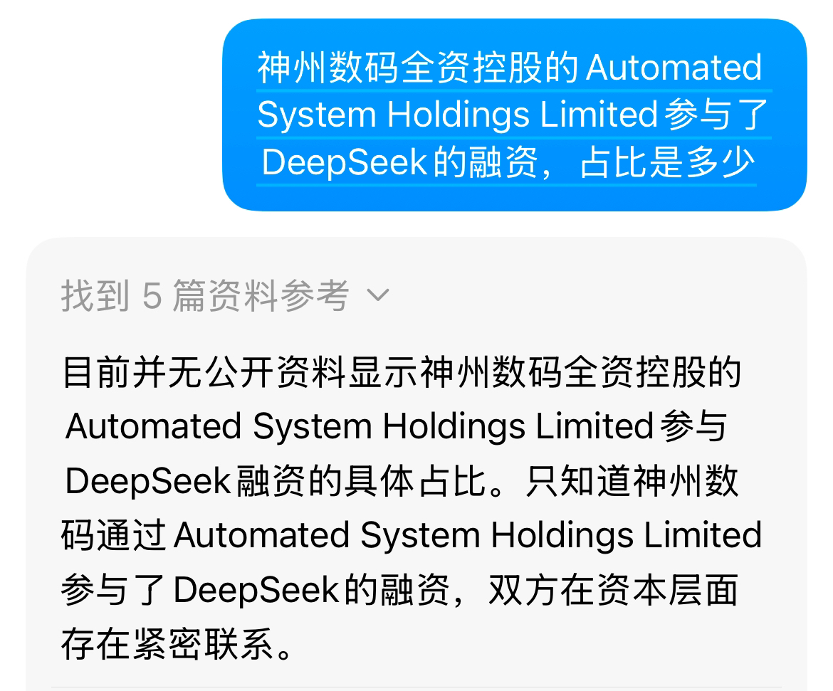 $神州数码(SZ000034)$ 大伙一起去问问,神州数码全资控股的Automated System Holdings Limited是否参与了DeepSeek的融资?