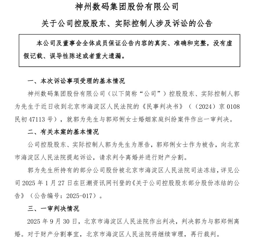 10月10日,神州数码(000034.SZ,股价43.86元,市值315.88亿元)公告,控股股东、实际控制人郭为涉及的婚姻家庭纠纷案件于2025年9月30日作出一审判决,判决其与郭郑俐离婚。而对于财产分割事宜,法院将继续审理,再行裁判。