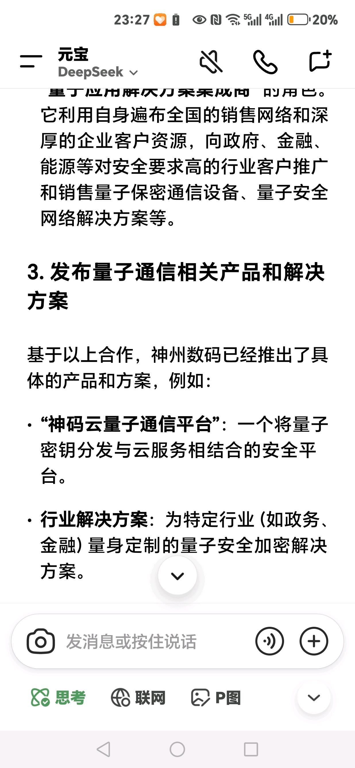 $神州数码(SZ000034)$ @妙想 神州数码与国盾量子(科大国盾,中国量子通信技术的领军企业)合作,成立了合资公司: ·合资公司名称:神州数码(中国)有限公司与科大国盾量子技术股份有限公司共同出资成立了“神州国盾量子科技有限公司”(简称:神州国盾)。 ·战略目标:这家合资公司旨在面向全球市场,提供量子通信设备、组建量子通信网络,并为行业客户提供量子通信解决方案及相关服务。这意味着量子通信是神州妆码一项明确的战略业务。