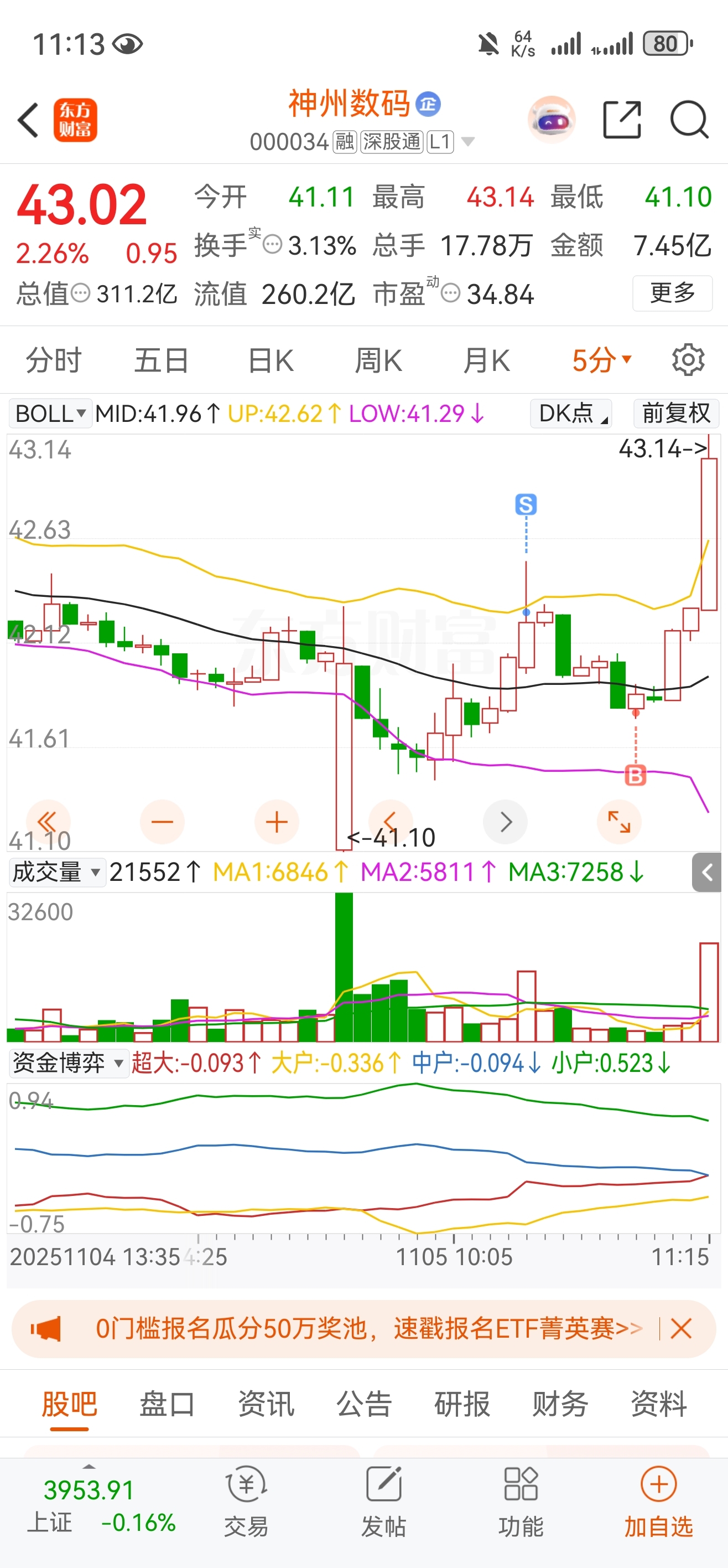 $神州数码(SZ000034)$ 今天一飞冲天之前用半仓做了个反t,舒服。