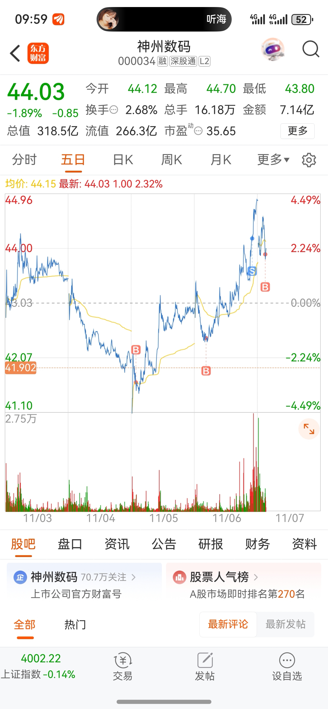 $神州数码(SZ000034)$ 43.92 吧昨天44.20t的接回,静等今天卖点