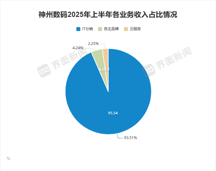 三季报并未披露具体业务线情况。从2025年中报来看,神州数码上半年实现营收同比14.42%至715.86亿元,归母净利润则同比下滑16.29%至4.26亿元。上半年,公司IT分销及增值服务业务实现营收683.9亿元,占总营收比重的95.54%,毛利率为2.7%,税后净利润4.8亿元;新业务中自有品牌产品业务、数云服务及软件业务分别实现营收31亿元、16.4亿元,毛利率10.3%、21.4%,税后净利润5957万元、3537万元,新业务营收合计占公司比重约6.62%。