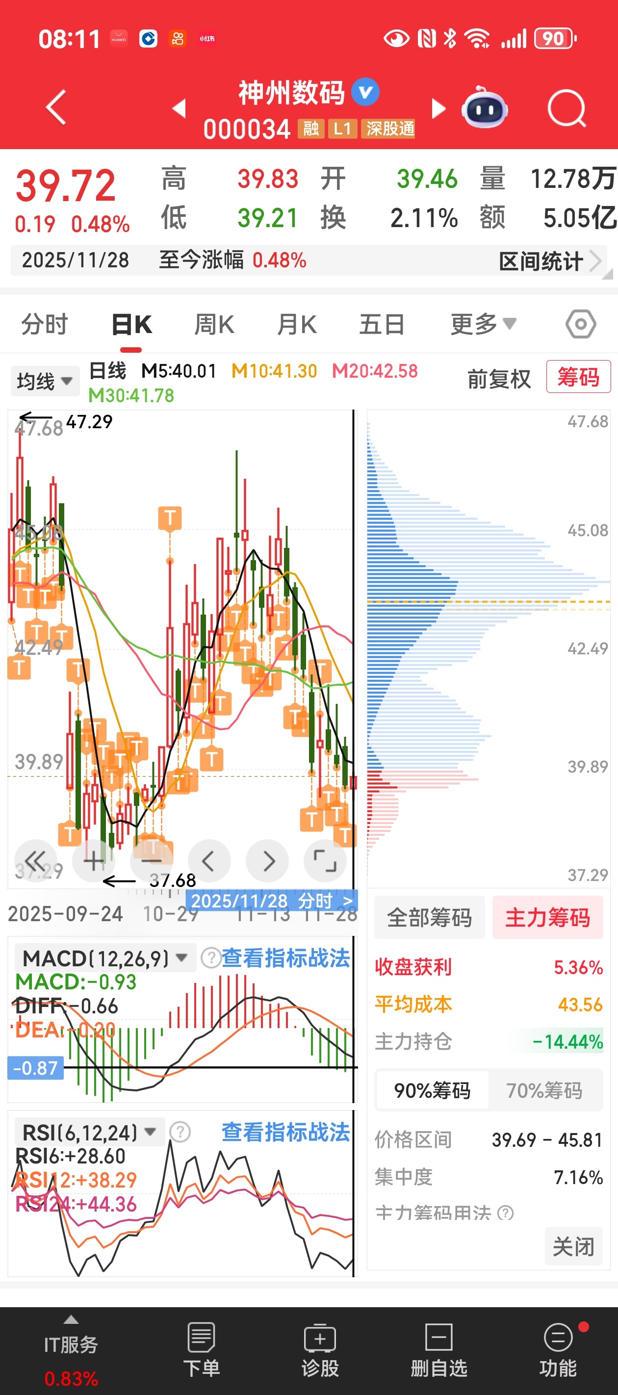 $神州数码(SZ000034)$ 主力操盘手水平真是低下,前后半月时间将十分有利局面断送,这两张主力筹码图就能清楚看出,成本没变,反而失去了底部筹码