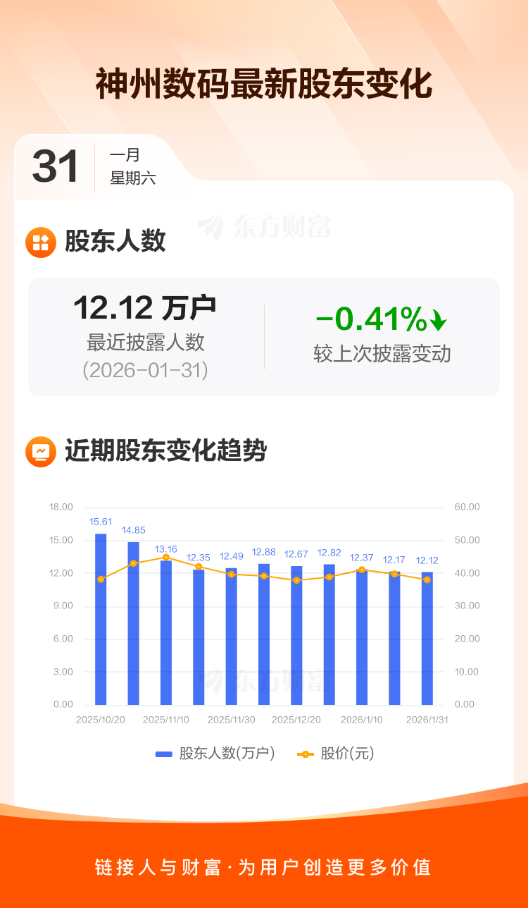 神州数码最新披露数据显示,截至1月31日公司股东户数为12.12万户,较上期(2026年1月20日)减少500户,降幅为0.41%。户均持有流通股数量由上期的4969股上升至4989股,户均持股金额由上期的19.77万元减少至18.98万元。