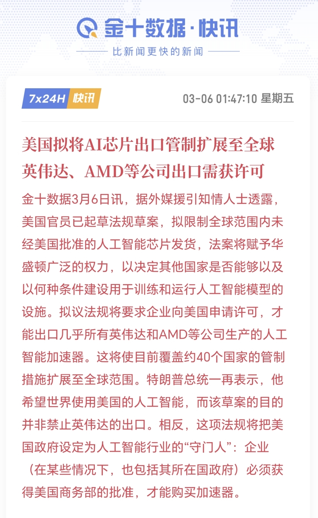 - 第一财经、财联社、同花顺财经(2026年3月6日关于美国AI芯片出口管制的联合报道)