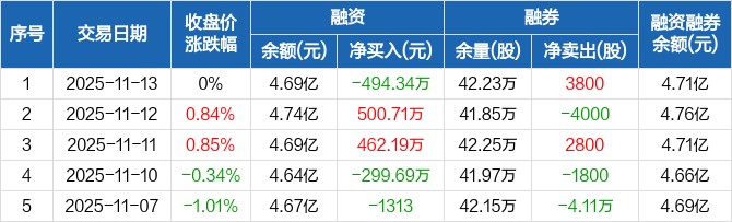 中国天楹:融资净偿还494.34万元,融资余额4.69亿元(11-13)