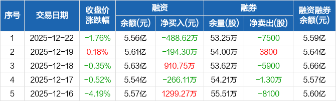 中国天楹:融资净偿还488.62万元,融资余额5.56亿元(12-22)