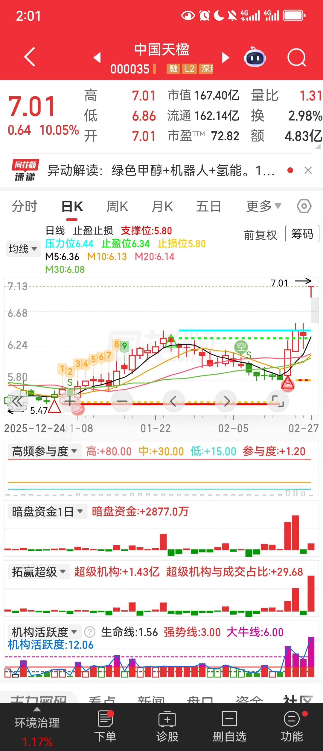 $中国天楹(SZ000035)$ 天楹下周一可能的三种走势分析:一是习惯流产型走势,高开低走,高位振荡几天后,又下台阶,正如小海鸥说的要补缺口;二是合理估值型走势,现在企业实质性转型变成绿色甲醇全球实际销售第一股,作为氢能源全球化旗帜,合理估值今年可看13-15,明年也许可看20以上,周一周二再现1-2个涨停板后,会进入波段式主升浪行情;三是游资炒作型走势,现在看不到龙虎榜,只能看到周五超级机构在涨停板买了1.43亿,占了总成交的30%,如果这个是游资选中,或游资在周一选中第二板入场,那说不定也会成为连板大妖。现在无法完全看清属于哪一种情型,只能盘中具体情况具体分析,有一点可以基本肯定,周一大概率不会闷杀,周五买进的会有肉吃。(个人分析,欢迎交流)