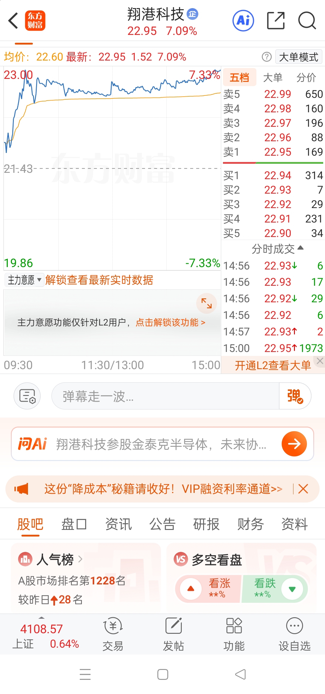 人气还是挺牛逼的,昨天大盘最高涨了一个多点,中国天楹跌了一个多点,同花顺人气12