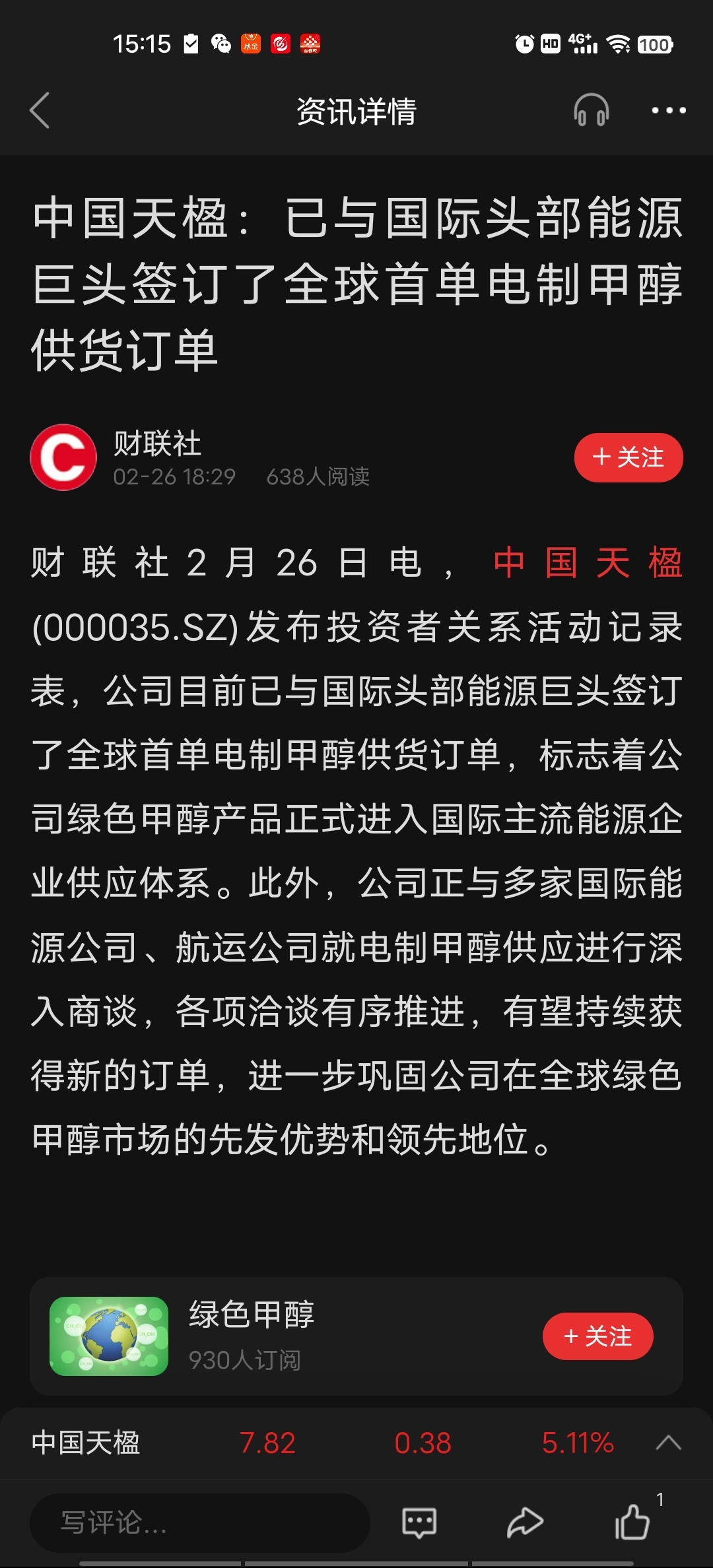 #收盘点评# @中国天楹 就凭这个全球首个绿色电制甲醇订单!你是不是要翻几个倍?以后能源替代的绝对核心标地!不管你火电,风电,核电,太阳能电,都可以做成替代石油的甲醇!