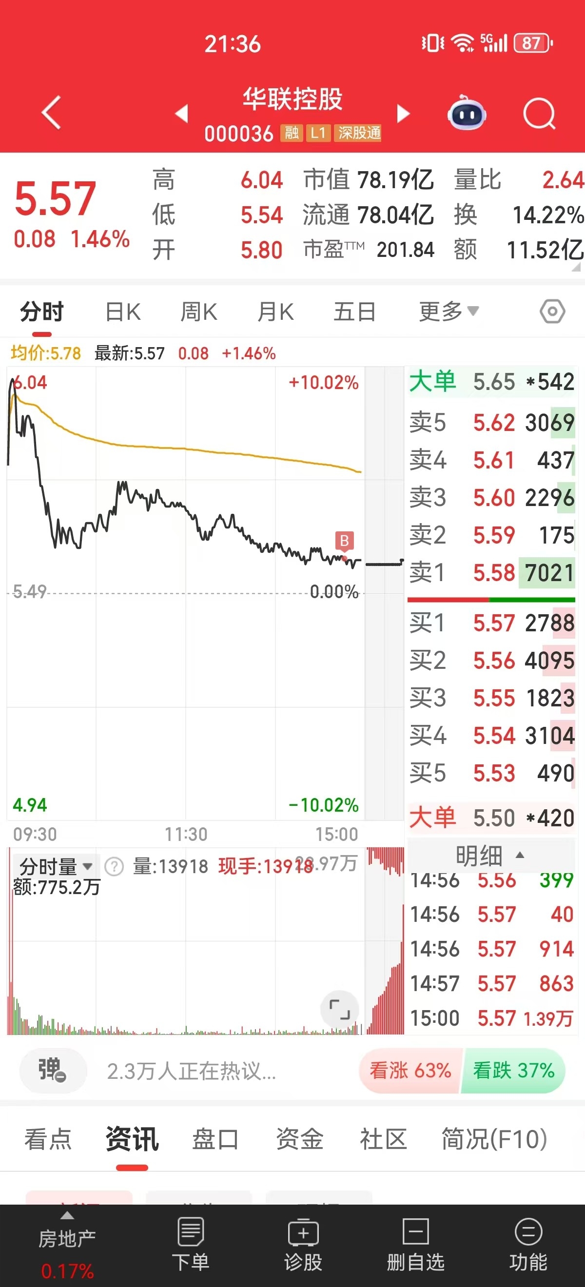 周一买入000036华联控股,盐湖提锂+新能源转型,今试盘上突6.04压力位,回
