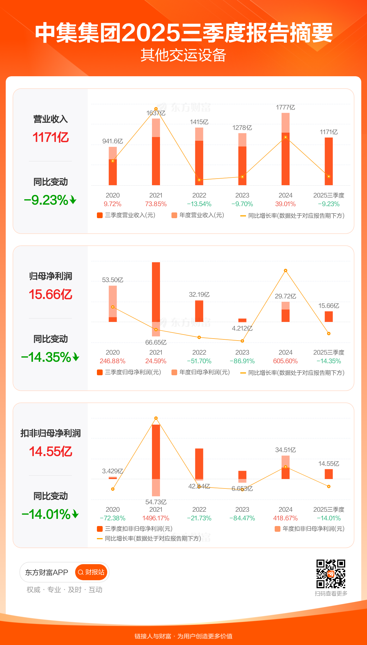 中集集团10月31日发布2025年三季报显示,公司前三季实现营业收入1170.61亿元,同比下滑9.23%;归母净利润15.66亿元,同比下滑14.35%;扣非归母净利润14.55亿元,同比下滑14.01%。