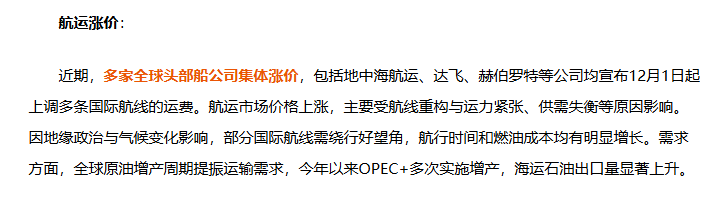 12月1日,多家全球头部船公司集体涨价