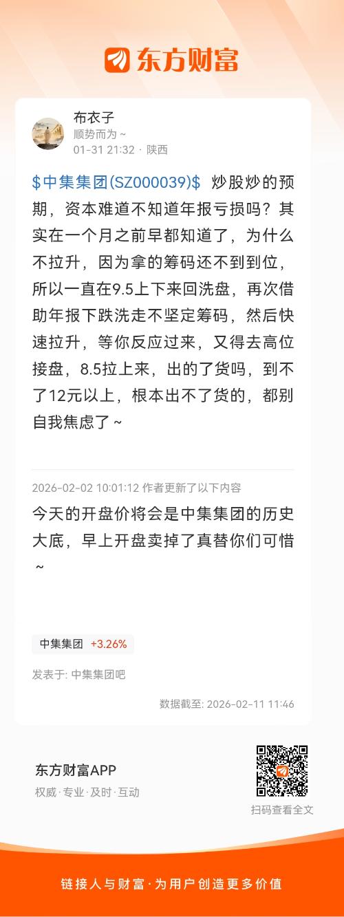 $中集集团(SZ000039)$ 炒股炒的预期,资本难道不知道年报亏损吗?其实在一个月之前早都知道了,为什么不拉升,因为拿的筹码还不到到位,所以一直在9.5上下来回洗盘,再次借助年报下跌洗走不坚定筹码,然后快速拉升,等你反应过来,又得去高位接盘,8.5拉上来,出的了货吗,到不了12元以上,根本出不了货的,都别自我焦虑了~