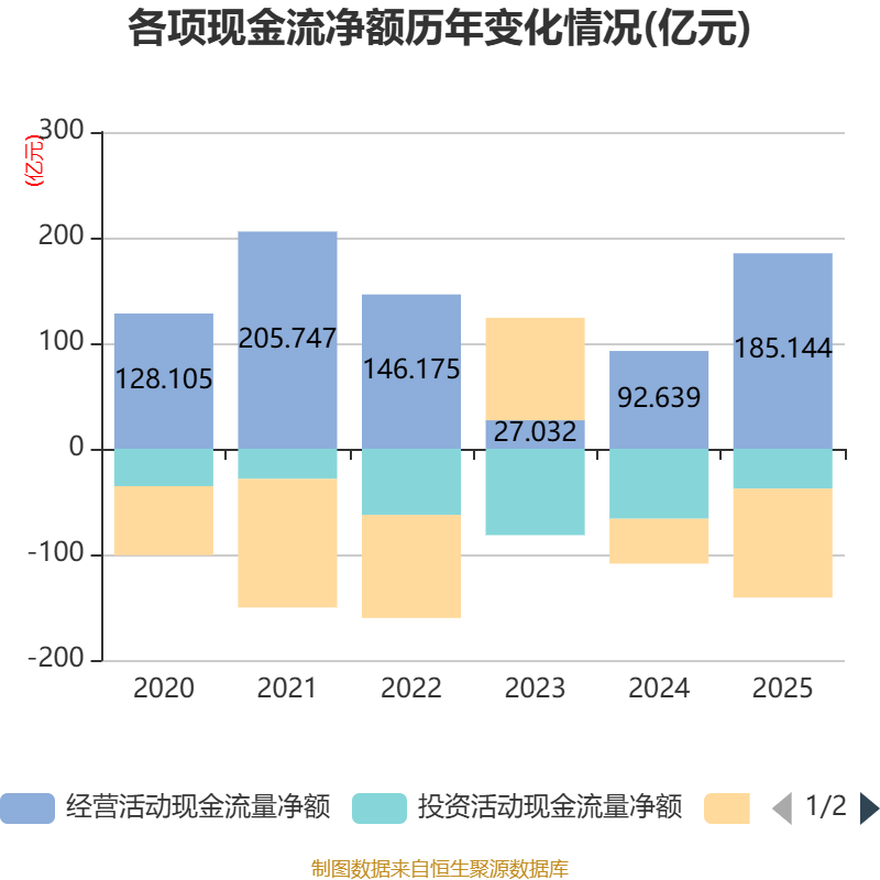 截至2025年,公司经营活动现金流净额为185.14亿元,同比增长99.86%;筹资活动现金流净额-103.2亿元,同比减少60.76亿元;投资活动现金流净额-37.67亿元,上年同期为-66.3亿元。