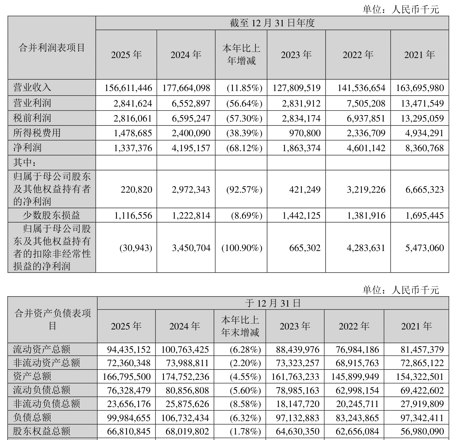 资产重大变化方面,截至2025年末,公司应收票据及应收账款较上年末减少20.09%,占公司总资产比重下降3.02个百分点;货币资金较上年末增加12.22%,占公司总资产比重上升2.17个百分点;固定资产较上年末减少0.28%,占公司总资产比重上升1.13个百分点;长期股权投资较上年末减少14.13%,占公司总资产比重下降0.69个百分点。
