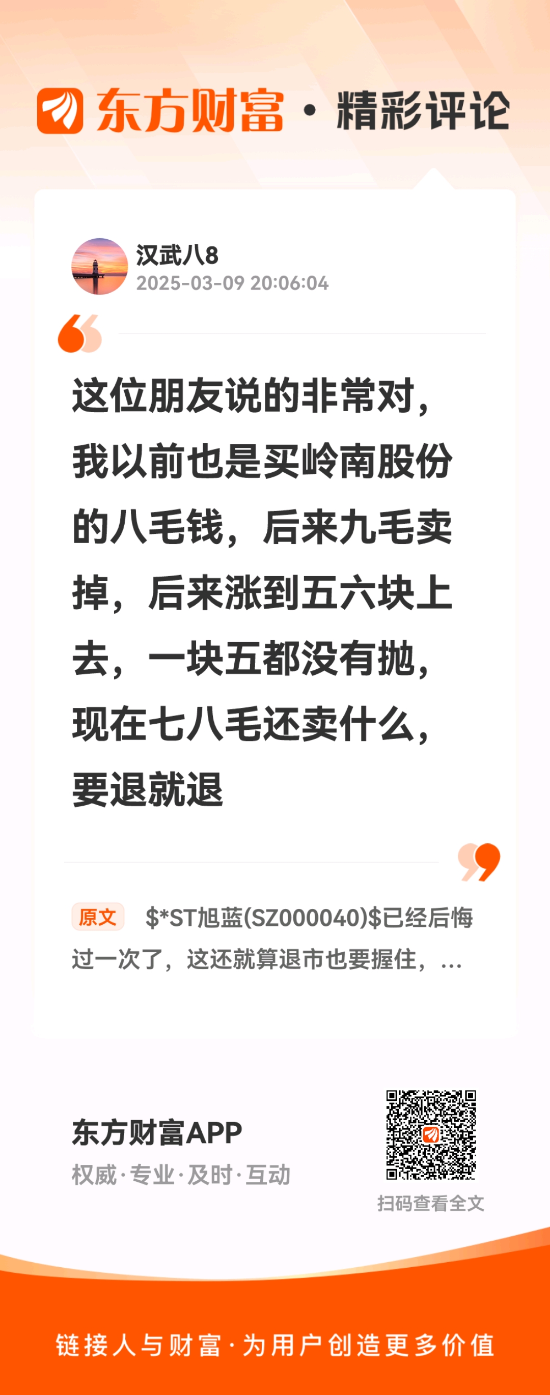 //@汉武八8 :这位朋友说的非常对,我以前也是买岭南股份的八毛钱,后来九毛卖掉,后来涨到五六块上去,一块五都没有抛,现在七八毛还卖什么,要退就退
