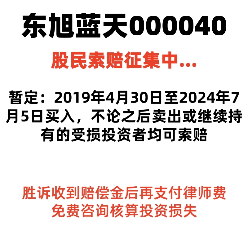 $*ST旭蓝(SZ000040)$ 2019年04月30日至2024年07月05日(含)期间有买入,无论在2024年07月05日后卖出或继续持有的受损投资者可联系索赔@索赔倒计时