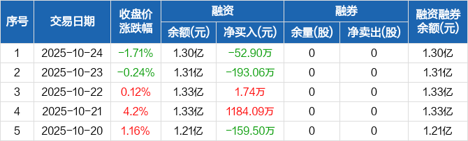 中洲控股:融资净偿还52.9万元,融资余额1.3亿元(10-24)