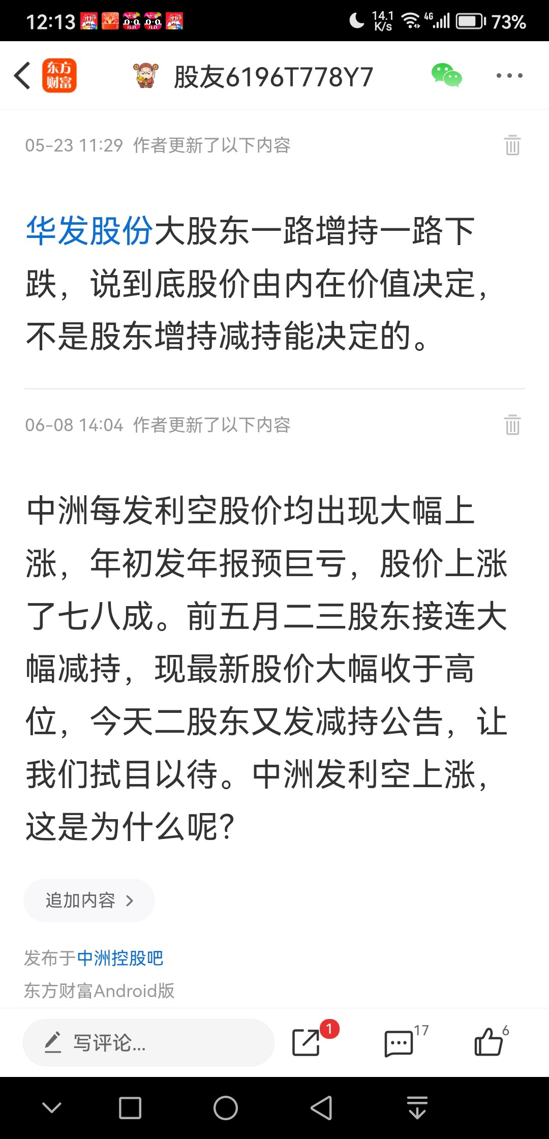 $中洲控股(SZ000042)$二三股东减持等于挂了一个此地无银三百两的牌牌,还有几个好心的熟面孔三天二头为此发帖解释,让大伙都散了,去别的地方发财。